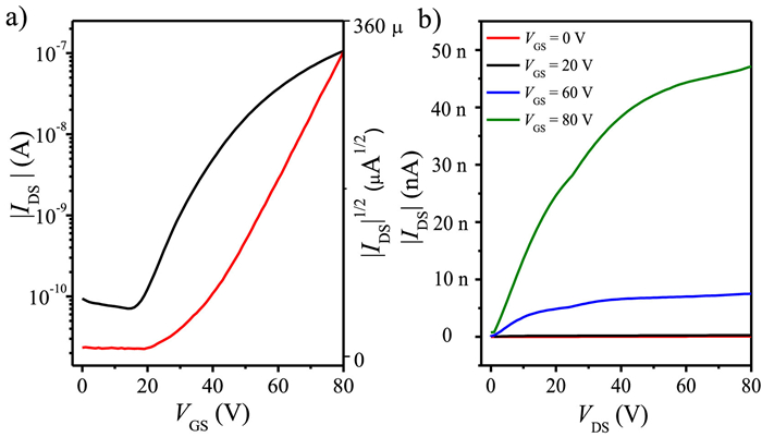 | Fig. 4. Transfer (a) and output (b) characteristics of Syn-B2S2 based bottom-gate top-contact OFETs (IDS = source-drain current, VGS = gate voltage, VDS = source-drain voltage channel length/width: 40/1000 (µm). | |