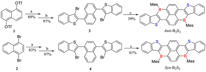 | Scheme 1. Synthesis of Anti-B2S2 and Syn-B2S2, Reagents and conditions: (a) 2-Benzothienylboronic acid, Pd(PPh3)4, K2CO3 (2 mol/L in H2O), dioxane, 90 ℃, 12 h; (b) Br2, DCM, r.t., 0.5 h; (c) ⅰ) n-BuLi (2.5 mol/L in hexane), toluene, 0 ℃, 0.5 h; ⅱ) BBr3 (1 mol/L in hexane), 0 ℃ - reflux, toluene, overnight; ⅲ) MesMgBr (1 mol/L in THF), toluene, r.t., 1 h. | |