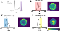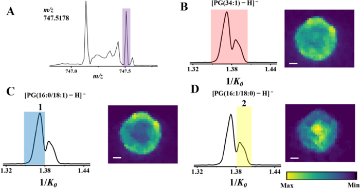 | Fig. 3. (A) MALDI-MS spectrum of the ion at m/z 747.5178. The ion peak was indicated by the purple histogram. (B) The mobilogram and image of the ion (red) at m/z 747.5178 illustrating two ion peaks. (C) The mobilogram and image of the ion 1 (blue). (D) The mobilogram and image of the ion 2 (yellow). Scale bars for all images were 200 µm. | |
