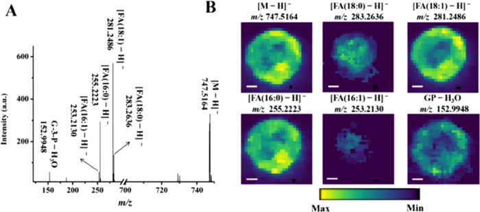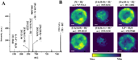 | Fig. 4. (A) MALDI-MS/MS spectrum of the [M − H]− ion at m/z 747.5164. (B) The images of the [M − H]− ion and its fragment ions. Scale bars for all ion images were 200 µm. | |