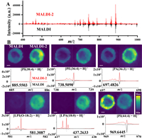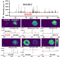 | Fig. 2. (A) Average spectra of HCT116 colon CCS sections analyzed with MALDI (red, bottom) and MALDI-2 (black, top) with the DHB matrix. There were three replicates in each group. (B) Representative MALDI-2-MS (right) and MALDI-MS (left) ion images of various lipids in colon CCS sections. Below the ion images, the spectra of various lipid ions analyzed with MALDI (red, bottom) and MALDI-2 (black, top) were provided. Black arrows indicated the corresponding ion peaks. Scale bars for all ion images were 200 µm. | |