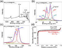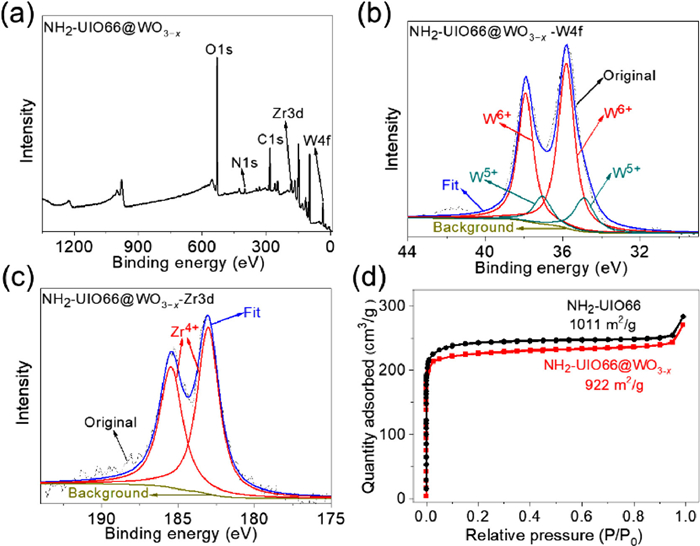 | Fig. 2. (a) XPS survey spectrum of NH2-UIO66@WO3−x. Narrow XPS scan spectra of (b) W 4f and (c) Zr 3d spectra of NH2-UIO66@WO3−x. (d) N2 adsorption-desorption isotherms curves of NH2-UIO66@WO3−x and NH2-UIO66. | |