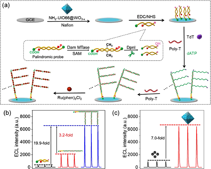 Based on the excellent ECL-promoting performance of NH2-UIO66@WO3−x for the Ru(phen)32+-ECL system, a signal-amplified ECL biosensor for Dam MTase was constructed using NH2-UIO66@WO3−x as a co-reactant. As shown in Fig. 4a, in the presence of Dam MTase, a palindromic probe was methylated at the adenine base and then specifically cleaved by the endonuclease DpnI, releasing DNA fragments with 3′-OH terminals. After the modification of NH2-UIO66@WO3−x nanocomposites onto GCE (NH2-UIO66@WO3−x/GCE), the released DNA fragments were covalently linked to NH2-UIO66@WO3−x on GCE via the -CO—NH- bond. The exposed 3′-OH terminals were then extended with dATP via TdT-mediated template-free polymerization to form poly-A chains [60], which subsequently hybridized with free poly-T fragments. Moreover, all the anchored poly-T fragments were continuously extended via TdT-mediated template-free polymerization to produce generous branched long poly-A chains, which were further hybridized with more free poly-T fragments. After multiple rounds of extension and assembly, a branched dsDNA nanostructure was formed on the NH2-UIO66@WO3−x modified GCE surface. It should be noted that with template-free branched polymerization, the branched dsDNA nanostructures can capture more ECL emitters of Ru(phen)3Cl2 onto the electrode surface to boost the ECL signal, and the ECL intensity of Ru(phen)3Cl2 can be correlated to the amount of Dam MTase in the biosensing system.