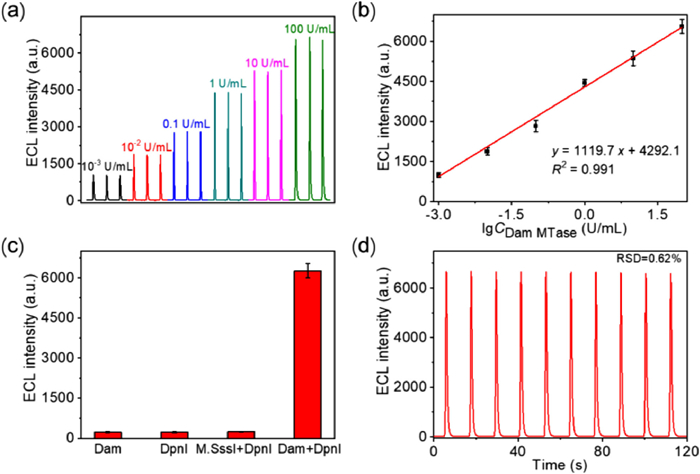 Under the optimized conditions (Fig. S13 in Supporting information), the ECL response of the dual signal-amplified biosensor for Dam MTase was recorded in the concentration from 1 × 10−3 U/mL to 100 U/mL (Fig. 5a). With increasing the Dam MTase concentration (Fig. 5b), a desirable linear relationship between the ECL signal (I) and the logarithm of Dam MTase concentration (lgCDam MTase) was obtained as I = 1119.7 lgCDam MTase + 4292.1 (R2 = 0.991), and the limit of detection (LOD) was calculated as 2.4 × 10−4 U/mL. The performance of the established biosensor was comparable to or superior to that of most of the previously reported detection methods (Table S1 in Supporting information).