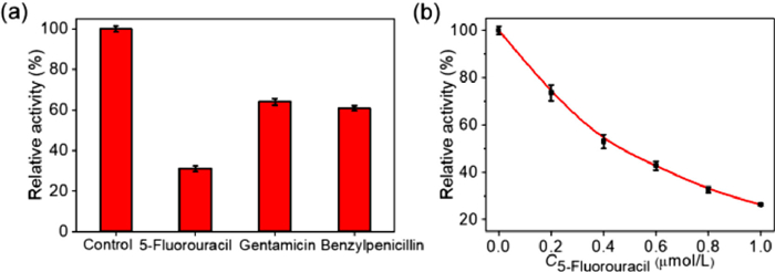 Precise screening of targeted DNA MTase inhibitors opens up new channels for clinical treatment and drug development. The Dam MTase inhibition assay was performed using gentamicin, penicillin, and 5-fluorouracil as inhibitors [63–65]. The results showed that all three inhibitors could inhibit Dam MTase activity (Fig. 6a). It was found that 5-fluorouracil was more effective in inhibiting the Dam MTase activity. As shown in Fig. 6b, Dam MTase activity gradually reduced under 5-fluorouracil treatment, and the half-maximal inhibitory concentration (IC50) of 5-fluorouracil was calculated as 0.47 µmol/L, which was consistent with the previous reports [61,62,65]. These results demonstrated that the proposed system can be widely applied to screen targeted DNA MTase inhibitors.