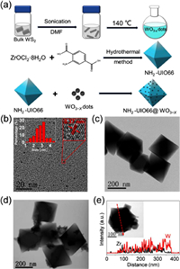 | Fig. 1. (a) Scheme for the preparation of NH2-UIO66@WO3−x. TEM images of (b) WO3−x dots, (c) NH2-UIO66 and (d) NH2-UIO66@WO3−x. (e) Elemental line scan of a single NH2-UIO66@WO3−x particle indicated by the dashed line in the inset. Inset in (b): Size distribution of the WO3−x dots. | |