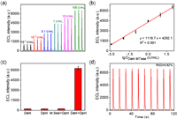 | Fig. 5. (a) ECL response of the biosensor to different concentrations of Dam MTase in 0.1 mol/L PBS (pH 7.4) containing 80 U/mL DpnI. (b) Calibration curve of the ECL biosensor for Dam MTase. (c) ECL response of the proposed biosensor to Dam MTase, DpnI, M.SssI MTase + DpnI and Dam MTase + DpnI under the same experimental conditions. (d) Signal stability of the biosensor for 10 U/mL of Dam MTase under 10 continuous scanning cycles in 0.1 mol/L PBS (pH 7.4) containing 80 U/mL DpnI. Potential scanning: 0 to 1.2 V, scan rate: 0.2 V/s, PMT: 800 V. | |