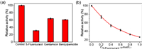 | Fig. 6. (a) Inhibitory effect of 1 µmol/L of different inhibitors on Dam MTase activity (100 U/mL). (b) Inhibitory effect of different concentrations of 5-fluorouracil on Dam MTase activity (100 U/mL). Potential scanning: 0 to 1.2 V, scan rate: 0.2 V/s, PMT: 800 V. | |