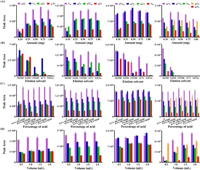 As a powerful sample pretreatment technique, SPE has been widely employed for sample cleanup [31,32]. We prepared cartridges filled with adsorbent of graphene, then evaluated and compared the enrichment efficiency of various modified nucleosides by using graphene-based SPE cartridges and other two types of SPE cartridges (Sep-pak C18 and Oasis MCX). We first optimized the experimental conditions of graphene-based SPE, including the amount of adsorbent, elution solvent, the percentage of acid in elution solvent, and elution volume. A mixture of modified nucleoside standards was used for optimization. As shown in Fig. 2A, the adsorption of most of these modified nucleosides increased gradually with increasing amounts of adsorbent up to 0.75 mg, whereas the extraction efficiency decreased with 1 mg of adsorbent. Therefore, 0.75 mg of adsorbent was used for subsequent experiments. Then, the types of elution solvents were optimized and several solvents including methanol, ethanol, isopropanol, acetonitrile and ethyl acetate were examined. The results revealed that methanol exhibited highest desorption capacity toward these modified nucleosides (Fig. 2B). Moreover, the presence of formic acid or acetic acid in methanol could improve the desorption of these modified nucleosides from the cartridge (Fig. 2C). Thus, methanol containing 0.1% acetic acid was selected as the elution solvent. We further optimized the elution volume and the results revealed that 1.5 mL of 0.1% acetic acid in methanol gave the best recovery (Fig. 2D).