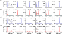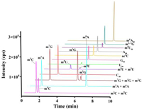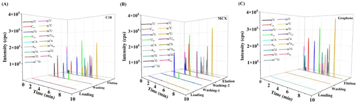 | Fig. 3. The MRM chromatograms of each SPE fraction obtained from the mixture of modified nucleoside standards pretreated with (A) C18 cartridge, (B) MCX cartridge, and (C) graphene-based cartridge. Graphene-based cartridges have best recoveries of all these modified nucleosides. | |