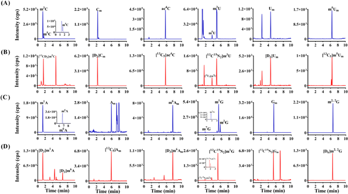 | Fig. 4. Identification of modified nucleosides in human urine. (A, C) The MRM chromatograms of modified nucleoside in human urine sample. (B, D) The MRM chromatograms of spiked stable isotope-labeled internal standards in human urine sample. | |