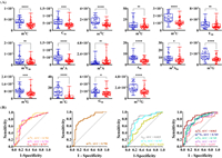 | Fig. 5. Quantification results of these modified nucleosides in urine samples from healthy controls and lung cancer patients. (A) Levels of modified nucleosides. Blue and red represent the modified nucleosides in urine from healthy controls and lung cancer patients, respectively. The y-axis represents the levels of modified nucleosides (nmol per mmol creatinine). ns, P > 0.05; P < 0.05; ***P < 0.001; ****P < 0.0001. (B) ROC analysis for modified nucleosides in urine samples from healthy controls and lung cancer patients. | |