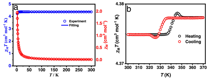Since a phase transition happens in temperature range of 300–370 K, thus high temperature χMT vs. T during heating/cooling for compound 1 were measured to study the magnetic phase transition. As shown Fig. 2b, upon heating, the χMT value increases slowly before a fast increase at 336 K, reaches the maximum value of 4.3785 cm3 K/mol at 346 K. Then the χMT value decreases fast to 4.3777 cm3 K/mol between 346 K to 352 K with the increase of temperature. When the temperature is above 353 K, the χMT value remains unchange. While for cooling, the χMT value decreases slowly before a fast decrease at 338 K, reaches the minimum value of 4.374 cm3 K/mol at 326 K. Then the χMT value increases fast, reaches the maximum value of 4.375 cm3 K/mol at 318 K with the decrease of the temperature. Next, the value of χMT unchange with decreasing temperature. The magnetic transition temperatures of compound 1 are 346 K and 326 K, leading to a thermal hysteresis loop width of 20 K, which is due to the order-disorder transition of the cation, originated from the coordination geometry change of Mn ion.