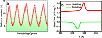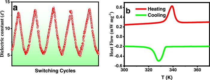 | Fig. 3. Reversible ε' switching of (a) dielectric curve and (b) DSC curve of compound 1. | |