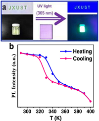 | Fig. 4. (a) The photograph of compound 1 powder under ambient light (left) and UV light irradiation (right). (b) The luminescence intensity of compound 1 at temperature increase and decrease versus temperature. | |