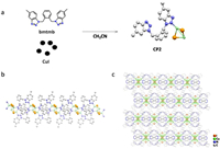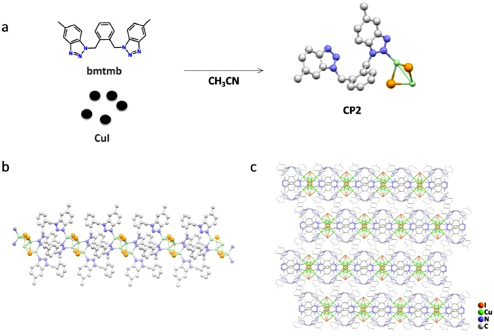 | Fig. 2. (a) The synthesis and X-ray crystal structure of CP2. (b) The 1-D chain structure of CP2. (c) The 2-D structure of CP2. Color code: Cu, green; I, orange; N, blue; C, gray. All hydrogen atoms are not shown for clarity. | |