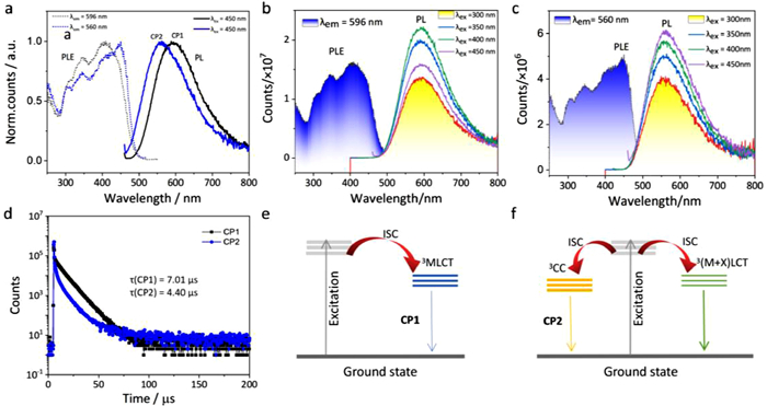 | Fig. 3. (a) PL excitation and emission spectra of CP1 and CP2 samples at 298 K. (b) PL spectra of CP1 under various excitation wavelengths. (c) PL spectra of CP2 under various excitation wavelengths. (d) Excited-state decay profiles of CP1 and CP2 at room temperature. (e) Excited-state decay pathways of CP1. 3MLCT, metal-ligand charger transfer transition. (f) Excited-state decay pathways of CP2. 3(M + X)LCT, mixed metal‒ & halide‒ligand charger transfer transition; 3CC, cluster-centered transition; ISC, intersystem crossing; Superscript '3′ refers to triplet excited state. | |