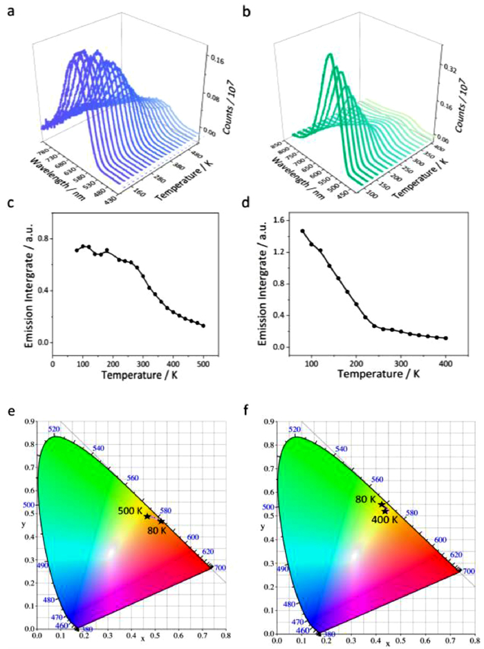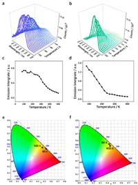 | Fig. 4. The variable-temperature PL spectra of (a) CP1 and (b) CP2. The temperature-dependent emission integrals of (c) CP1 and (d) CP2. Variable-temperature CIE coordinates of (e) CP1 and (f) CP2. | |