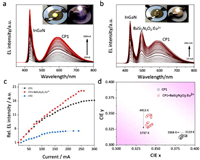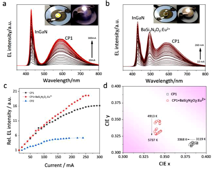 | Fig. 5. (a) EL spectra of CP1-prototype LED with a 428-nm LED chip under flux operating currents of 10–300 mA. (b) EL spectra of integrated CP1 and commercial BaSi2N2O2:Eu2+pc-wLED with a blue LED chip (λmax = 428 nm) under flux operating currents of 10–260 mA. The insets show the photographs of the device with power off (left) and power on (right). (c) Current-dependent EL intensity for single-component CP1 and its dual-component wLED, as well as single-component CP2. (d) CIE chromaticity coordinates of CP1-prototype wLED (black square) as well as the commercial BaSi2N2O2:Eu2+-based pc-wLED (red circle). | |