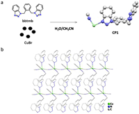 | Fig. 1. (a) The synthesis and X-ray crystal structure of CP1. (b) Two-dimensional network structure of CP1. Color code: Cu, green; N, blue; C, gray. All hydrogen atoms are not shown for clarity. | |