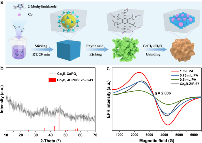 | Fig. 1. (a) Schematic diagram for the preparation of Co2B-CoPOx. (b) XRD pattern of Co2B-CoPOx. (c) EPR spectra of as-synthesized samples at different volume of PA. | |