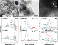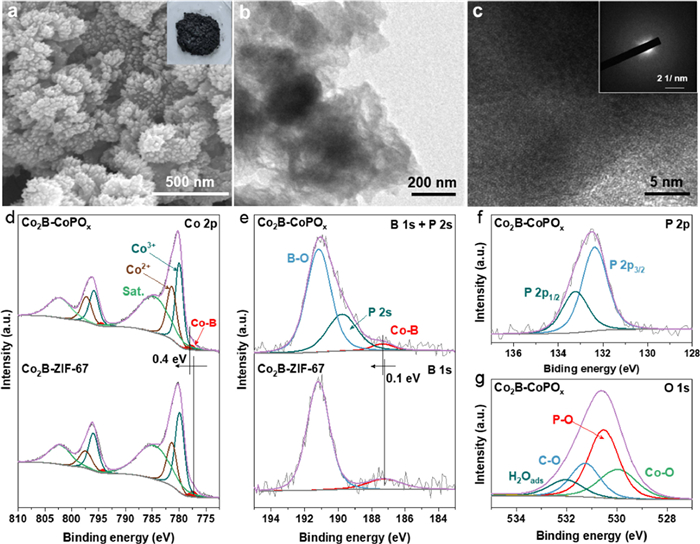 | Fig. 2. (a) SEM image of Co2B-CoPOx. (b) TEM and (c) high-resolution TEM (HR-TEM) images of Co2B-CoPOx (inset: SADE pattern). High resolution XPS spectra of (d) Co 2p and (e) B 1s for Co2B-CoPOx and Co2B-ZIF-67. (f) P 2p and (g) O 1s for Co2B-CoPOx. | |