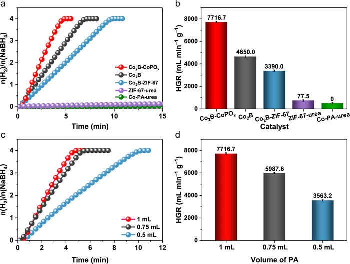 | Fig. 3. (a) The equivalent H2 per mole of sodium borohydride versus time with different catalysts and (b) the corresponding HGR values. (c) The equivalent H2 per mole of sodium borohydride versus time with different volume of PA and (d) the corresponding HGR values. | |