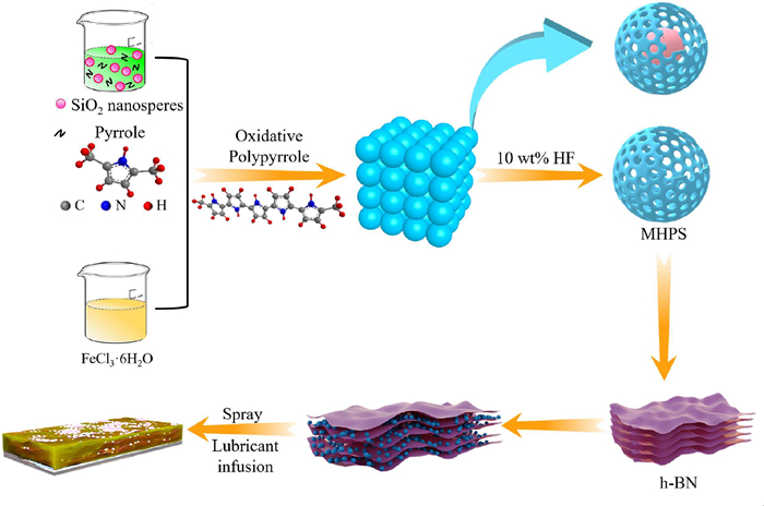 As the deepening of biological knowledge of nature, the concept of SLIPS was presented by Aizenberg et al. which was inspired by natural nepenthes pitcher plants in 2011 [14]. The dense lubricant layer and the unique super slip properties of SLIPS provide a more stable anti-corrosion property for SLIPS [15]. Moreover, the SLIPS exhibits excellent anti-icing and anti-contaminant properties [16]. In recent years, anti-corrosion coatings based on SLIPS have been continuously designed and prepared. For example, Long et al. [17] used the natural porous structure of attapulgite (APT) to cleverly avoid the complex pore formation process traditionally used to make SLIPS. The SLIPS with anti-corrosion were then prepared by infusing lubricants into these natural pores. Zhang et al. [18] prepared a double-layer SLIPS with excellent corrosion resistance composed of dense under layer and porous top layer. Thus, the preparation of SLIPS by infusing lubricants into porous structures opens new horizons in the design and fabrication of Mg alloy anti-corrosion coatings [19]. However, currently reported SLIPS are mostly failed to provide sufficient capillary forces, which largely limits the filling and efficient storage of lubricants. Especially some fluorine lubricants are chosen as the lubricant layer, when the lubricant leakage will cause irreversible damage to the environment. Therefore, it is an urgent need to develop a SLIPS with abundant mesoporous structure for metal anti-corrosion. In addition, the polypyrrole (PPy) and h-BN as both excellent corrosion protection materials for Mg alloy anti-corrosion, the former by forming a passivation film on the Mg alloy thus inhibiting the onset of corrosion and the latter graphite-like structure prolongs the erosion path of corrosive media. For the above reasons, PPy and h-BN are widely applied as fillers for anti-corrosion coatings. Li et al. [20] utilized a simple electroplating and spray-coating method to fabricate a superhydrophobic coating with excellent corrosion protection on Mg alloy, which consists of under layer of graphene oxide and top layer of PPy/ZIF-8. Chen et al. [21] selected to compound polydopamine functionalized carbon powder with PPy to fabricate a conductive coating that could significantly avoid the occurrence of pitting. Li et al. [22] prepared a BN/ZrO2 composite coating by sol-gel method. The electrochemical test results indicated that the addition of h-BN greatly enhanced the anti-corrosion ability of the coating. Wang et al. [23] prepared BN@CF composite material by grafting polydopamine modified carbon fibres onto h-BN. Subsequently, BN@CF composite material was applied to produce a coating with excellent corrosion resistance. However, the PPy as a filler in anti-corrosion coatings has the possibility to aggravate the corrosion phenomenon due to its high electrical conductivity [24]. Moreover, the poor dispersibility of original h-BN hinders its application as a coating filler [25]. Hence, the selection of h-BN with high insulating properties combined with PPy on the one hand suppresses the conductivity of PPy. On the other hand, the insertion of the PPy into the h-BN sheet structure greatly improves the dispersion of the h-BN. Most importantly, we have not only solved the problem of using PPy and h-BN as fillers for anti-corrosion coatings but have also succeeded in constructing SLIPS with abundant pore structure on Mg alloy by preparing MHPS and intercalating MHPS into the h-BN lamellar structure.