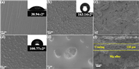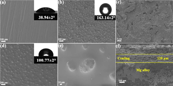 | Fig. 2. FE-SEM images of surface appearance of (a) bare Mg alloy, (b, c) SHS coating and (d, e) SLIPS coating at low and high magnification. (f) Cross-section FE-SEM images of SHS. The insets of (a), (b) and (d) are the WCA of the bare Mg alloy, SHS coating and SLIPS coating. | |