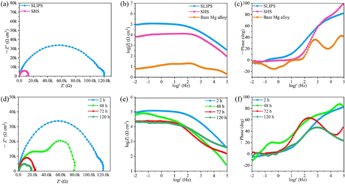 | Fig. 3. Electrochemical impedance spectra (EIS) results of the bare Mg alloy, SHS and SLIPS coating. (a) Nyquist plots, (b) Bode-module plots, (c) Bode-phase plots. Long-term anti-corrosion properties of SLIPS. (d-f) Nyquist plots, Bode-module plots, and Bode-phase plots after 2 h, 48 h, 72 h and 120 h immersion in 3.5 wt% NaCl solution. | |
