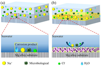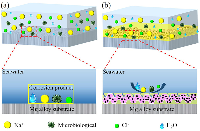 | Fig. 4. (a) Corrosion mechanism of bare Mg alloy. (b) Anti-corrosion mechanism of SLIPS. | |