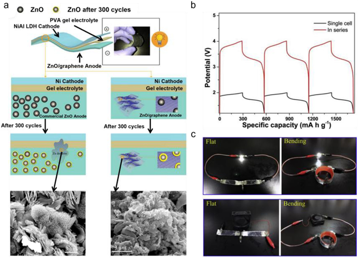 | Fig. 1. (a) Schematics of flexible quasi-solid-state Ni-Zn secondary battery based on commercial ZnO anode or ZnO/graphene anode. (b) Galvanostatic charge/discharge curves of single Ni-Zn battery and two batteries in series at the current density of 5 A/g. (c) A 3 W LED and a 5 W cooling fan powered by two Ni-Zn batteries in series at flat or bending conditions. Reproduced with permission [76]. Copyright 2018, Elsevier. | |