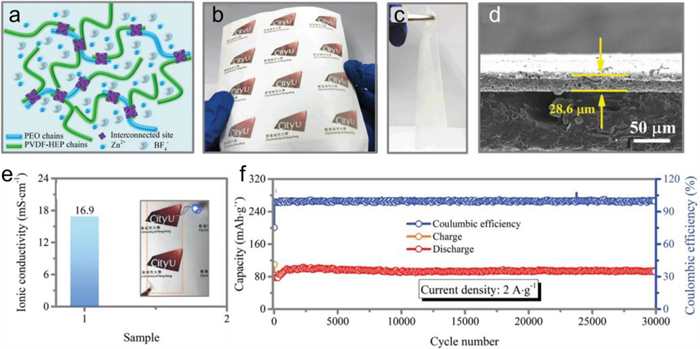 | Fig. 11. (a) Gelation mechanisms of polymer network of PHP-ILZE formed by the intermolecular hydrogen binding effect. (b, c) Optical photograph of a PHP-ILZE films. (d) Cross-sectional SEM image of a thin PHP-ILZE. (e) Ionic conductivity of the all-solid-state PHP-ILZE. (f) Cyclic performances of Zn-cobalt ferricyanide battery at 2 A/g. Reproduced with permission [171]. Copyright 2020, Wiley-VCH. | |