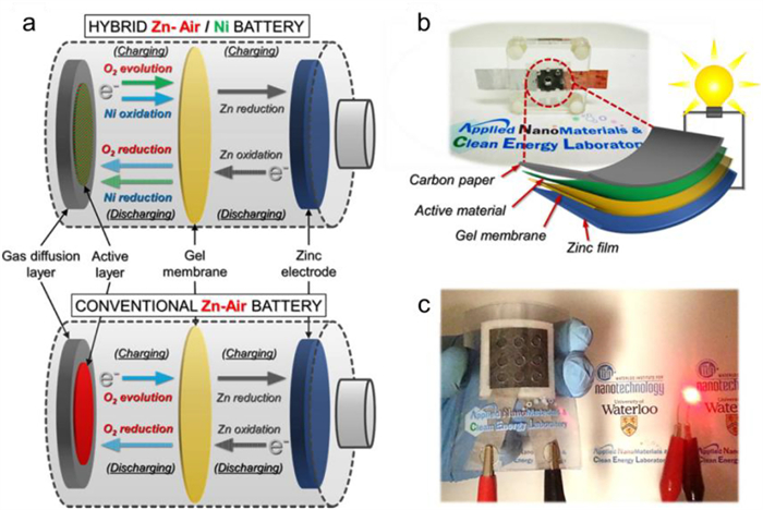 | Fig. 2. The hybrid battery consisting of zinc-air/nickel battery. (a) Schematics of electrochemical processes in hybrid zinc-air/nickel battery (top) and zinc-air battery (bottom). (b) Solid-state hybrid and rechargeable battery pattern. (c) Flexible hybrid battery demonstration. Reproduced with permission [83]. Copyright 2016, American Chemical Society. | |