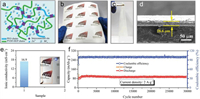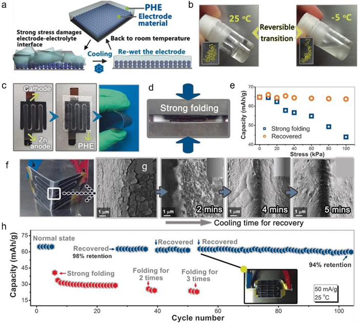 | Fig. 4. (a) The cooling-recovery function of a thermoreversible electrolytes based on PEO-PPO-PEO. (b) Photographs of PEO-PPO-PEO electrolytes at different temperatures. (c) Top-view and cross-sectional photographs of the flexible Zn-LiMn2O4 battery. (d) Photographs of Zn-LiMn2O4 battery under strong folding. (e) Capacity variation of battery under folding and recovering with different stresses. (f) The photograph of the battery that has been broken electrode/electrolyte interface. Top-viewed SEM images of (g) the broken electrode/electrolyte interface owing to the strong folding (100 kPa), and the recovered area after cooling for different time at −5 ℃. (h) Cycling performance of the battery at different positions (25 ℃). Reproduced with permission [122]. Copyright 2017, Wiley-VCH. | |