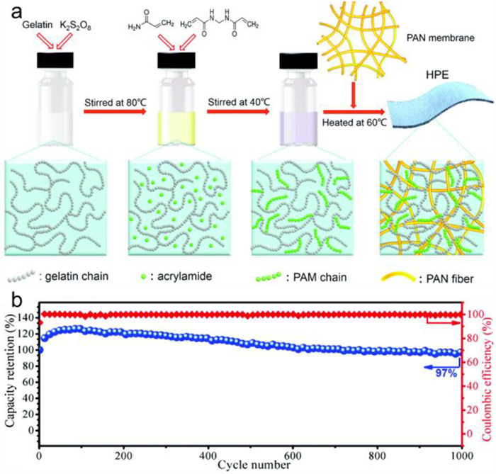 Compared with the physical gel based on hydrogen bonds, the strong interaction formed through chemical crosslinking agents endows HGPEs with excellently mechanical strength (such as stretchability and compressibility) and some unique functions (for example, self-healing properties, anti-freezing and heat-resistant properties). Furthermore, the chemical crosslinking is conductive to improving ionic conductivity due to the enhancement of capacity of water retention. For acquiring the HGPEs with outstanding chemical, electrochemical and mechanical properties, dual-crosslinking may be a practicable way.