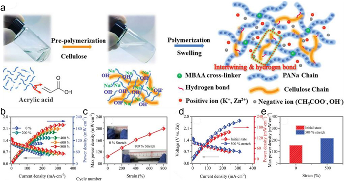 | Fig. 8. (a) Synthetic procedure of the PANa-cellulose hydrogel electrolytes. (b) Power density curves of the Zn-air battery with a strain from 0 to 800%. (c) Max power density as a function of the tensile strain. (d) Polarization curves of Zn-air battery under different deformation conditions. (e) Max power density with the tensile strain of 0 and 500%. Reproduced with permission [139]. Copyright 2019, Wiley-VCH. | |