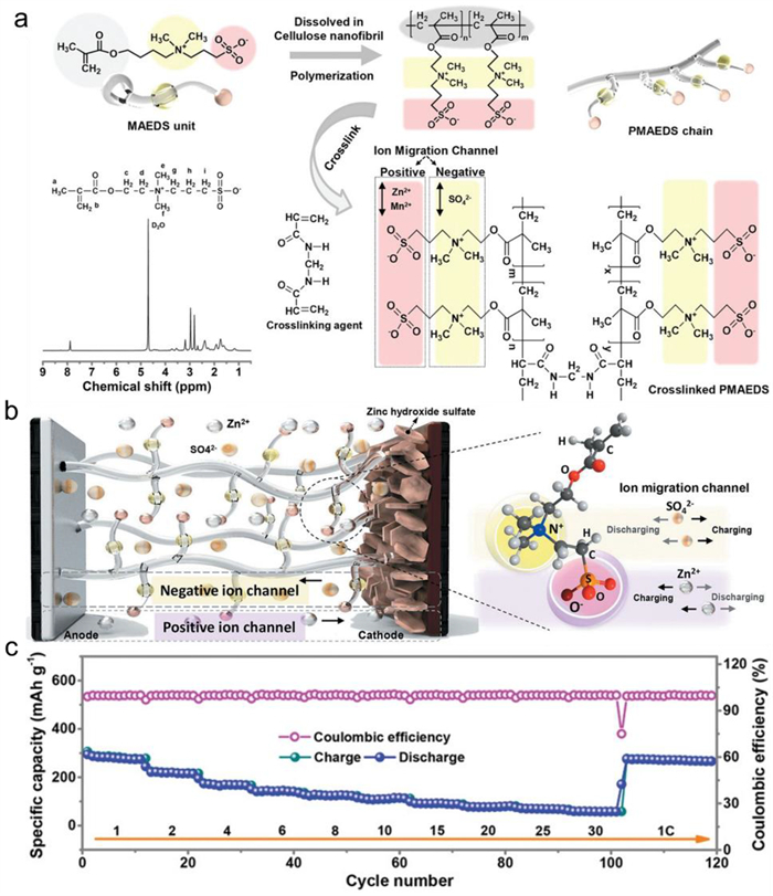 Zwitterions, structurally similar with the imidazolium-based ionic liquids, contain covalently bonded cations and anions (such as sulfonate, carboxylate, or imide). In recent years, zwitterions have attracted extensive interest as a potential polymer matrix of HGPEs due to the following preponderance. First, thanks to the strong interactions between the charged groups and water molecules, it is well soluble in water and comfortable to polymerize even without addition of initiators. Thus, polyzwitterions are suitable for a polymer matrix. Secondly, the zwitterionic nature enables the cationic and anionic counterions of polyzwitterions to easily separate during the process of ion transference, thus leading to a high ionic conductivity. Furthermore, the dipole-dipole physical interaction among the zwitterionic groups endows the polyzwitterion-based gel with a certain mechanical strength. Thirdly, the charged and polar groups on polyzwitterions are beneficial to improving adhesion between the electrodes and electrolytes, thus HGPEs based on the polyzwitterions can serve as a binder to keep the electrodes integrated and help to decrease the interface resistance. What is more, it has been proved that zwitterions can be used as electrolytes with high ionic conductivity and transference number of Li+ [144,145]. Considering these merits, introducing zwitterions into the HGPEs used for ZBs may be feasible. Yuan et al. [146] introduced the zwitterionic [2-(methacryloyloxy)ethyl]dimethyl-(3-sulfopropyl) (SBMA) into the hydrous solution of AM monomer to improve the ionic conductivity. Thanks to the excellent ability of dissociating salts and formation of hydration channels for ion migration, the resulting electrolytes held the high ionic conductivity of 10.38 mS/cm at −20 ℃ and the Zn-LiFePO4 battery showed an excellent cycling stability with a capacity retention of 72.6% (1000 cycles). However, the “salt-like structure” of polyzwitterions usually enable the hydrogel to present the brittleness. Mo et al. [147] fabricated zwitterionic sulfobetaine/cellulose hydrogel electrolytes with semi-interpenetrating networks (Fig. 9), which could enable hydrous Zn-MnO2 battery to show superior electrochemical performances and mechanical strength. The hydrogel electrolytes were synthesized through the polymerization of zwitterionic sulfobetaine monomer of [2-(methacryloyloxy)ethyl]diethy-(3-sulopropyl) (MAEDS) and cellulose nanofibrils were employed as the supporting skeleton. Specially, all monomers were resulted from the natural plants. The zwitterionics of MAEDS not only demonstrated an excellent water retention due to the strongly electrostatic interactions between zwitterionic groups and water molecules but helped ion to transfer because of the formation of channels for ion migration, and both benefitted to improve the rate performances. The physical entanglement and intertwining between cellulose nanofibrils and PMAEDS covalent networks dramatically enhanced the mechanical strength. Owing to these synergistic effects, the obtained electrolytes demonstrated an ionic conductivity of 24.6 mS/cm and excellent stretchability of 920%. Meanwhile, the Zn-MnO2 battery also displayed a high capacity of 148 mAh/g (in accordance with MnO2) at 6.5 C and a capacity retention of 90.42% (1200 cycles) compared with the initial capacity. Surprisingly, a high capacity of 74 mAh/g (in accordance with MnO2) could be observed even at 30 C. In addition, the assembled Zn-MnO2 battery with the designed electrolytes possessed extraordinary flexibilities, showing that the Zn-MnO2 battery with a length of 7.5 cm and curvature radius of 1.5 cm was able to withstand the various bending states in the range of 0–180° and keep electrochemically stable. Accordingly, the zwitterionic sulfobetaine/cellulose hydrogel electrolytes showed great potential for flexible and wearable electronics. The development of hydrogel electrolytes based on zwitterions is still in the initial stage and thus this work leaves plenty of room to improve electrochemical performance of solid-state ZBs via chemical design of polyzwitterion electrolytes.