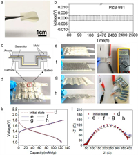 | Fig. 10. (a) Photograph of PEO-based composite electrolyte. (b) Galvanostatic cycling curves of the cells with composite electrolyte films. (c) Model used for plastic deformation studies. (d-h) Zn battery employed the prepared composite electrolytes under different plastically deformation. (i) Open-circuit voltage of Zn-γ-MnO2 battery with square wave shape plastic deformation. (j) LED light powered by the two serial batteries. (k) Galvanostatic charge and discharge curves of the corrugated Zn-γ-MnO2 (d-h) at 0.2 C. (l) EIS curves of the original and plastically deformed corrugation batteries (d-h). Reproduced with permission [168]. Copyright 2019, American Chemical Society. | |