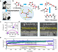 | Fig. 12. (a) Digital photograph of the liquid 4 mol/L Zn(BF4)2/DOL solution and PDOL electrolytes induced by 2 mmol/L Al(OTf)3. (b) Ring-opening polymerization mechanism of DOL. (c) EIS profiles of the symmetric Zn/Zn cells assembled with ex-situ and in-situ methods. (d) SEM images of PDOL/Zn interface formed by in-situ and ex-situ methods. (e) Cyclic performances of Zn-CoHCP batteries. Reproduced with permission [182]. Copyright 2020, Wiley-VCH. | |