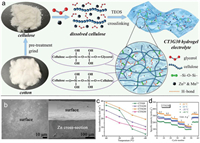 2.3.2. Chemical crosslinking by covalent Si−O bondsIn addition to the unideal stretchability, the compressible and healable ability are still unsatisfied. Chen et al. [130] constructed a versatile HGPEs via employing cellulose made from cotton as polymer framework and tetraethyl orthosilicate (TEOS) as the crosslinker, and glycerol as the anti-freezing agent. TEOS transformed into Si(OH)4 in present of water, which is able to link the hydroxyl groups of cellulose and the glycerol via covalent siloxane bonds (−Si−O−Si−), and thus a 3D porous framework formed (Fig. 5). When 5 mL and 30 mL of TEOS and glycerol was used respectively, the obtained HGPEs possessed the best properties, as exemplified by its high ionic conductivity (19.4 mS/cm at −40 ℃), outstanding mechanical properties (tensile strength of 2.11 MPa and fracture elongation of 846.5%), great self-healing ability, high adhesion, and good heat-resistance ability. What is more, this HGPEs were able to significantly inhibit the dendritic growth of zinc anode and parasitic side reactions from −40 ℃ to 60 ℃. Accordingly, the flexible quasi-solid-state Zn-MnO2 battery showed remarkable energy densities and outstanding cycling stability from −40 ℃ to 60 ℃.