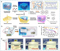 | Fig. 6. (a) Schematic synthesis routine of the elastomer-coated alginate/PAM (polyacrylamide) organohydrogel electrolyte and the manufacturing process of elastomeric coating. (b) The electronic watch powered by EA battery working at 25 ℃ and −20 ℃. (c) Capacity retention of the EA battery at −20 ℃ and discharge curves at different storage time intervals. (d) Heat-resistant test achieving by powering an electronic watch in boiling water. Reproduced with permission [131]. Copyright 2019, Wiley-VCH. | |