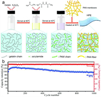 To further enhance the mechanical stretchability and stability of PANa-based electrolytes under the strongly alkaline environment, Ma et al. [139] prepared a dual-network PANa-cellulose composite electrolytes, which was obtained by directly adding cellulose into the hydrous solution of PANa-based electrolytes synthesized by polymerization of acrylic acid (Fig. 8). As a consequence, the PANa-cellulose gel electrolytes showed a stretchability of over 1000% in 6 mol/L KOH solution and a high ionic conductivity of 0.28 S/cm. In addition, the obtained electrolytes could be used to prepare integrated air electrode and zinc spring electrode, leading to 800% stretchability of the flat-shape battery, 500% stretchability of the fiber-shaped battery, excellent flexibility and/or weave ability. Similarly, Guan et al. [140] and Zang et al. [141] also employed the PANa-based electrolytes to assemble Zn-air batteries. Specially, Braam et al. [142] synthesized the crosslinked PANa-based electrolyte films by UV light-induced free radical polymerization, which employed poly(ethylene glycol) divinyl ether (PEGDE) (Mn ≈ 250 g/mol) as crosslinker and poly(ethylene oxide) (PEO) as fillers (Mv ≈ 600,000 g/mol). PEO helped to improve the mechanical strength of the PANa-based electrolyte films. Thanks to the ultrahigh ionic conductivity of 0.4 S/cm and excellent mechanical strength, the printed Zn-Ag2O battery delivered a discharge capacity of 5.4 mAh/cm2 at a current density of 2.75 mA/cm2. Different from the above method of preparing PANa-based electrolytes, Pei et al. [143] firstly synthesized PAA polymer in the ice-water bath and then it was soaked into the KOH/Zn(Ac)2 mixture to obtain the PAA-based HGPEs. It showed a high ionic conductivity of 0.2 S/cm even at −20 ℃, higher than that of PAA-based HGPEs employed commercial. Thus, the chemical polymerization of acrylic acid is conductive to acquire the electrolytes with excellent electrochemical properties and mechanical strength due to the formation of covalent bonds.