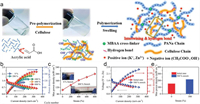 | Fig. 7. (a) Synthesis schematic of the PANa-based hydrogel electrolytes. (b) Stretchability of the PANa hydrogel electrolytes infused with concentrated ions and deionized water, respectively. Reproduced with permission [137]. Copyright 2019, American Chemical Society. | |