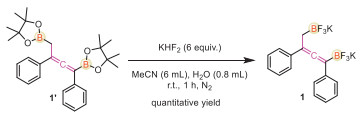 Although the optimal reaction conditions were well established, the purification of 1′ was challenging. This is because the 1,4-diborylated allene 1′ was found to be more fragile than other organoboron compounds with Bpin moiety. It would decompose simultaneously during the separation on silica gel and alumina as well. This problem was finally solved when the Bpin group was transformed into its fluoroborate form (Eq. 1). Upon treatment with KHF2 in aqueous acetonitrile [57,58], the 1,4-diborylated allene 1′ was converted into the corresponding fluoroborate 1 in a quantitatively yield. Furthermore, this protocol can be directly used in a one-pot process after the completion of 1,4-diborylation of 1,3-enynes without isolation of the allene products with two Bpin moieties and the fluoroborate precipitated as a pure product.