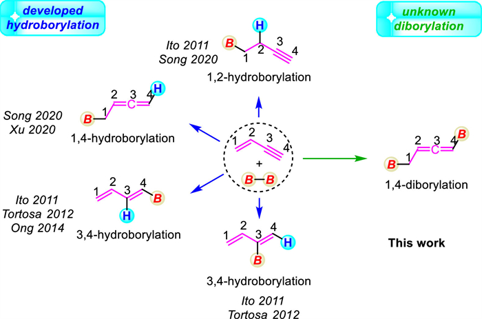 On the other hand, 1,3-enynes [33-35] are common and useful building blocks in synthetic chemistry, which enable straightforward transformations for rapid assembling of molecular complexity [36-39]. Direct borylation of 1,3-enynes by using the bis(boronate) reagent B2pin2, will afford several kinds of organoboron compounds (Scheme 1) [40]. For examples, Sasaki et al. developed a copper-catalyzed hydroborylation of 1,3-enynes with B2pin2. The 1,3-dienylboronates and 3-alkynylboronates were regio- and stereo-selectively afforded as major products and the different regioisomeric preference was supposed to be determined by both of the substrates and the catalytic complex [41]. Alfaro et al. found that the borylcopper species generated from ligand exchange with B2pin2 preferred to add on C–C triple bond of the 1,3-enynes even with a terminal C–C double bond [42], which is distinct from Cu-catalyzed hydroboration of 1,3-enynes through the Cu–H species [43,44]. Interestingly, Kuang et al. reported a regio- and stereo-divergent copper-catalyzed mono-hydroboration and di-hydroboration of 1,3-enynes for the synthesis of 1,4-hydroborylated allenes, 1,3-diborylated alkenes, and 1,4-diborylated alkenes [45]. Although various methods for borylation of 1,3-enynes have been nicely developed [46-49], approaches for direct diborylation of 1,3-enynes, forming 1,4-diborylated allenes, have not yet been reported.