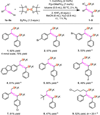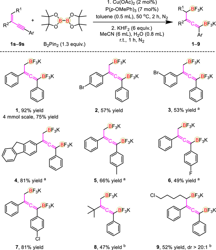 | Scheme 2. Substrate scope of 1,3-enynes when R3 is an Ar group. Reaction was conducted with 1,3-enyne (0.5 mmol), B2Pin2 (0.65 mmol), Cu(OAc)2 (2 mol%), P(p-OMePh)3 (7 mol%) in toluene (0.5 mL) at 50 ℃ for 2 h, and then with KHF2 (3 mmol) in aqueous solution of MeCN/H2O (6 mL:0.8 mL) at r.t. for 1 h. a P(p-OMePh)3 was replaced by PPh3. b P(p-OMePh)3 was replaced by PCy3. | |