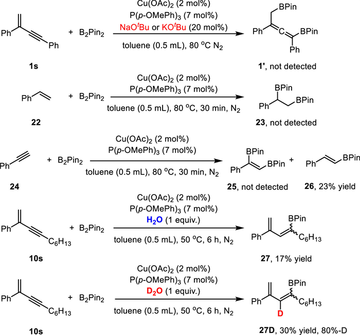 Initially, we found that when the toluene solution of but‑3-en-1‑yne-1,3-diyldibenzene (1s) and B2Pin2 was stirred at 80 ℃ with Cu(OAc)2/P(p-OMePh)3 as the catalytic system, the desired 1,4-diborylated allene (1′) was produced in a yield as high as 69% (Table 1, entry 1). The result of this reaction clearly indicated that regioselective 1,4-diborylation of 1,3-enynes can be achieved. It also suggested that instead of forming the reported hydroborylation products as mentioned, this reaction might be improved as a highly efficient method for the synthesis of 1,4-diborylated allenes.