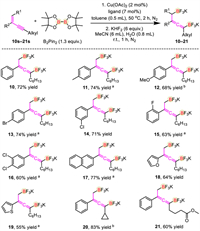 | Scheme 3. Substrate scope of 1,3-enynes when R3 is an alkyl group. Reaction was conducted with 1,3-enyne (0.5 mmol), B2Pin2 (0.65 mmol), Cu(OAc)2 (2 mol%), P(p-OMePh)3 (7 mol%) in toluene (0.5 mL) at 50 ℃ for 2 h, and then with KHF2 (3 mmol) in aqueous solution of MeCN/H2O (6 mL:0.8 mL) at r.t. for 1 h. a P(p-OMePh)3 was replaced by PPh3. b P(p-OMePh)3 was replaced by PCy3. | |