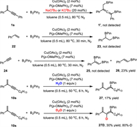 In summary, we have developed the first selective 1,4-diborylation of 1,3-enynes for the formation of 1,4-diborylated allenes by copper catalysis, which is different from the reported copper-catalyzed hydroborylation of 1,3-enynes with B2Pin2 as the borylating reagent. Because of the instability of these allenes with Bpin moieties on column purification, they were transformed into the corresponding stable fluoroborates in situ. The substrate scope was broad and the reaction conditions were mild. Results of control experiments supported that the reaction might be initiated by the addition of the Cu–B species (Ⅰ) on the C≡C bond.